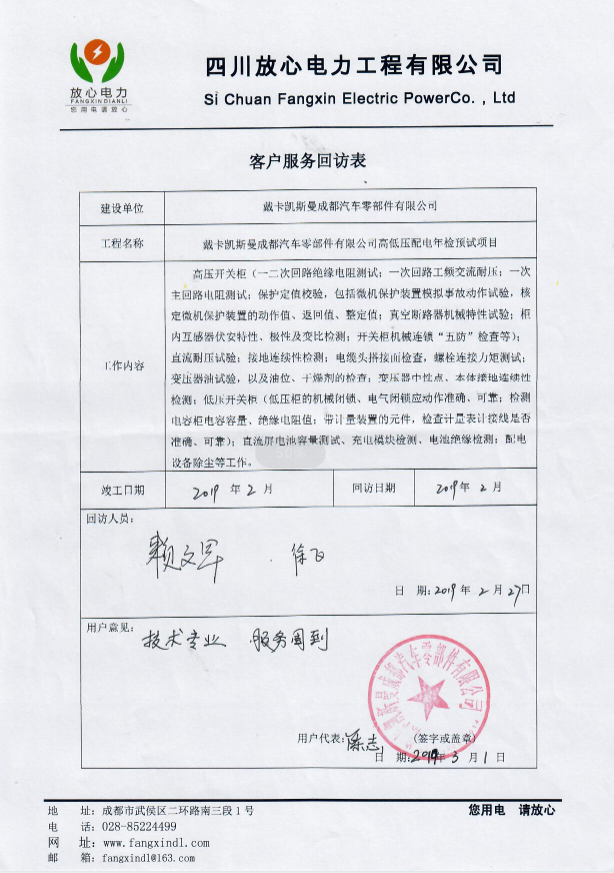 戴卡凯斯曼成都汽车零部件有限公司高低压配电年检预试项目